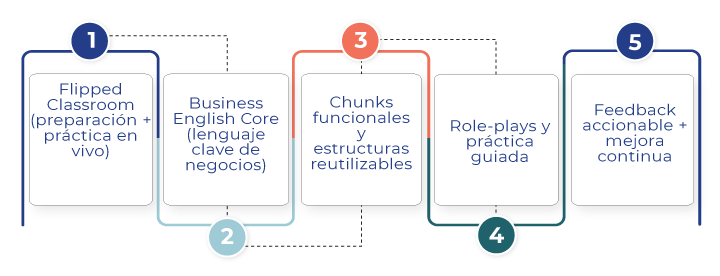 Llegas a clase con una preparación corta (pre-class) y en la sesión nos enfocamos en practicar, hablar, comprender y usar el idioma en situaciones de negocio. - Business English Core (lenguaje clave de negocios)